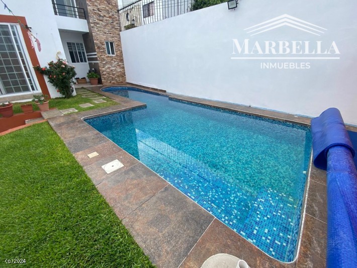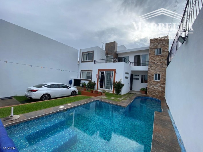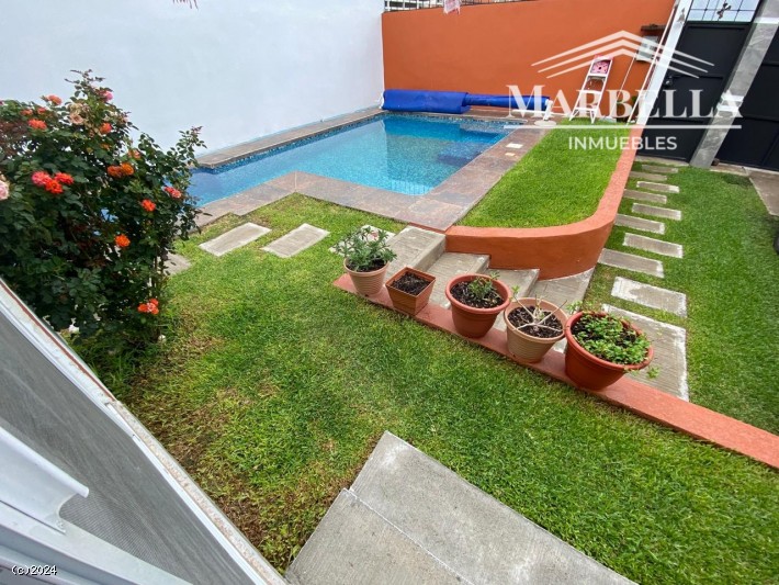 Adquiera esta hermosa casa con agradable vista. En dos niveles, cuenta con recámara en planta baja. Cuatro recámaras en total, tres baños y medio. Cocina equipada, cuarto de lavado. En planta alta se encuentra una terraza amplia con vista. Alberca con calefacción solar y carril de nado. Con jardín y barda.