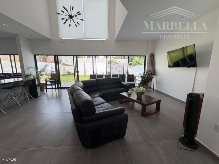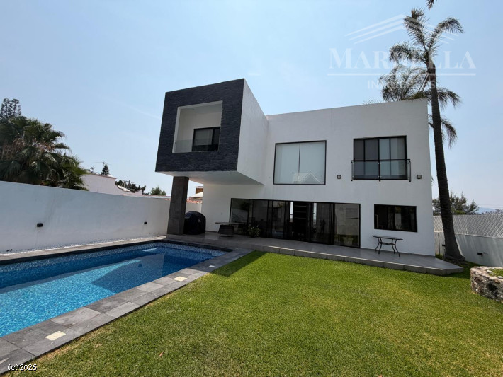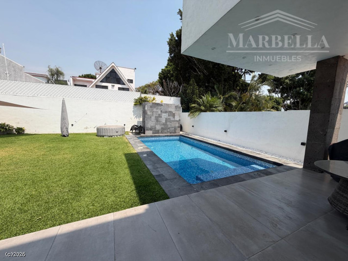 Estancia en doble altura, medio baño para visitas, cocina abierta, área de lavado, habitación con baño completo, terraza, jardín equipado con alberca.